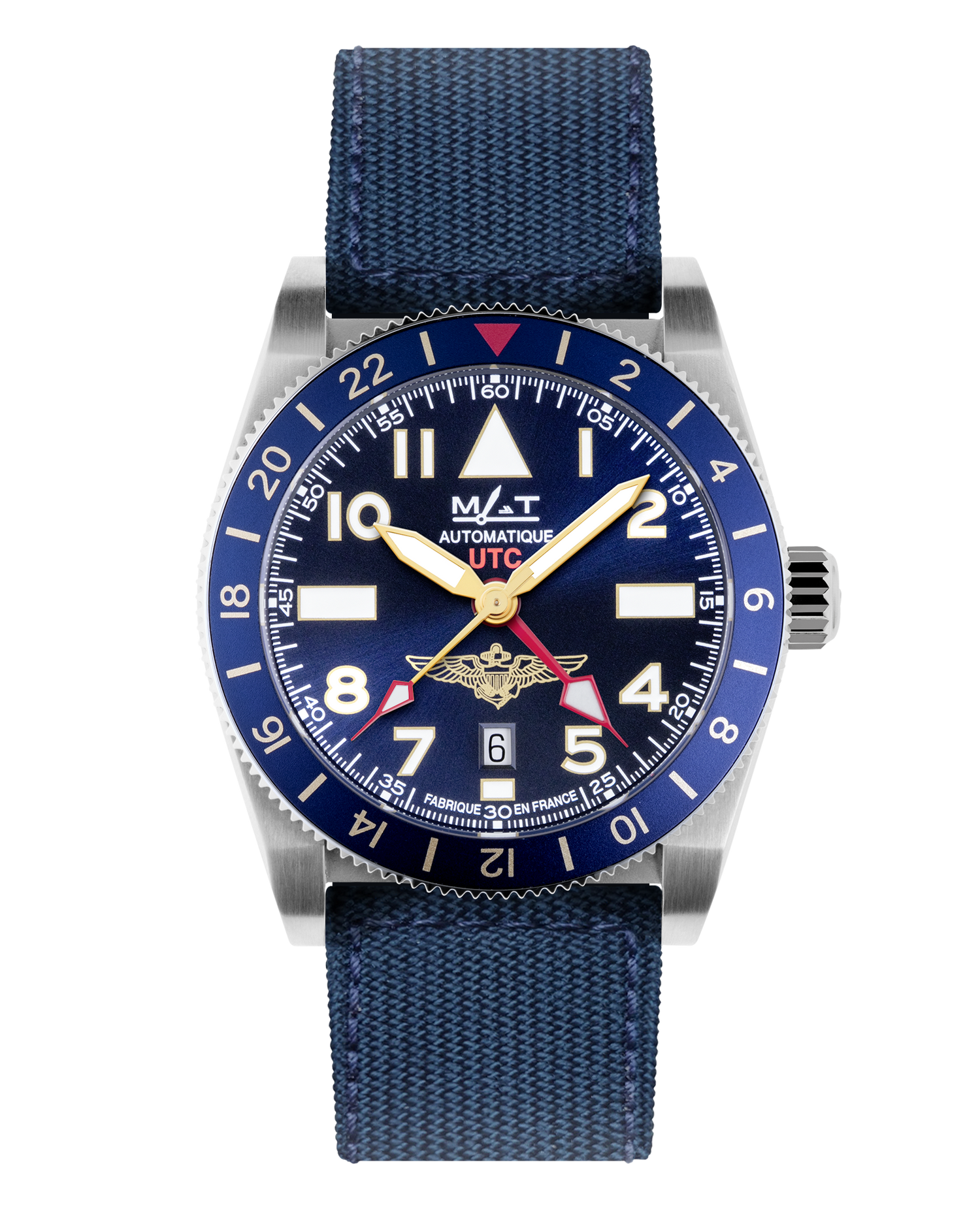 With more than 30 years of military and civilian flight operation experience, Jerry «Leekster» Leekey has beginning his career in corporate aviation, he was later selected to be a US Navy F-14 Tomcat Fighter Pilot. His passion for aviation and his life experiences are expressed in the design of these new MATWATCHES timepieces - they are truly an expression of his desire to create the quintessential pilot wristwatch. In the spring of 2015, we designed our first Naval Aviation timepiece. This year we went for a radical vintage look. Protected by a robust 316L surgical steel case of 42.5 mm, its dark blue dial (sun-ray finishing) with its oversized index and arabic figures in super luminova (BGW9:blue glow white) features pilots’ wings at 6 o’clock. This new UTC is equipped with a unidirectional turning bezel in blue aluminium, with guilted figures indicating the second time zone for perfect legibility