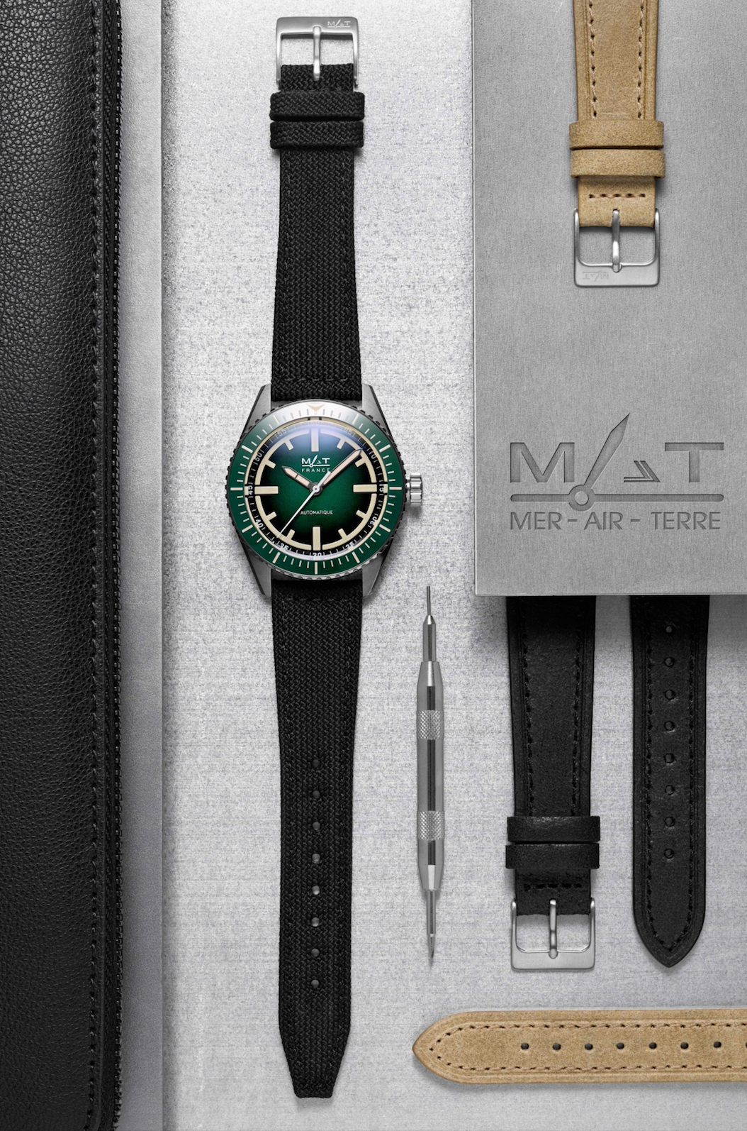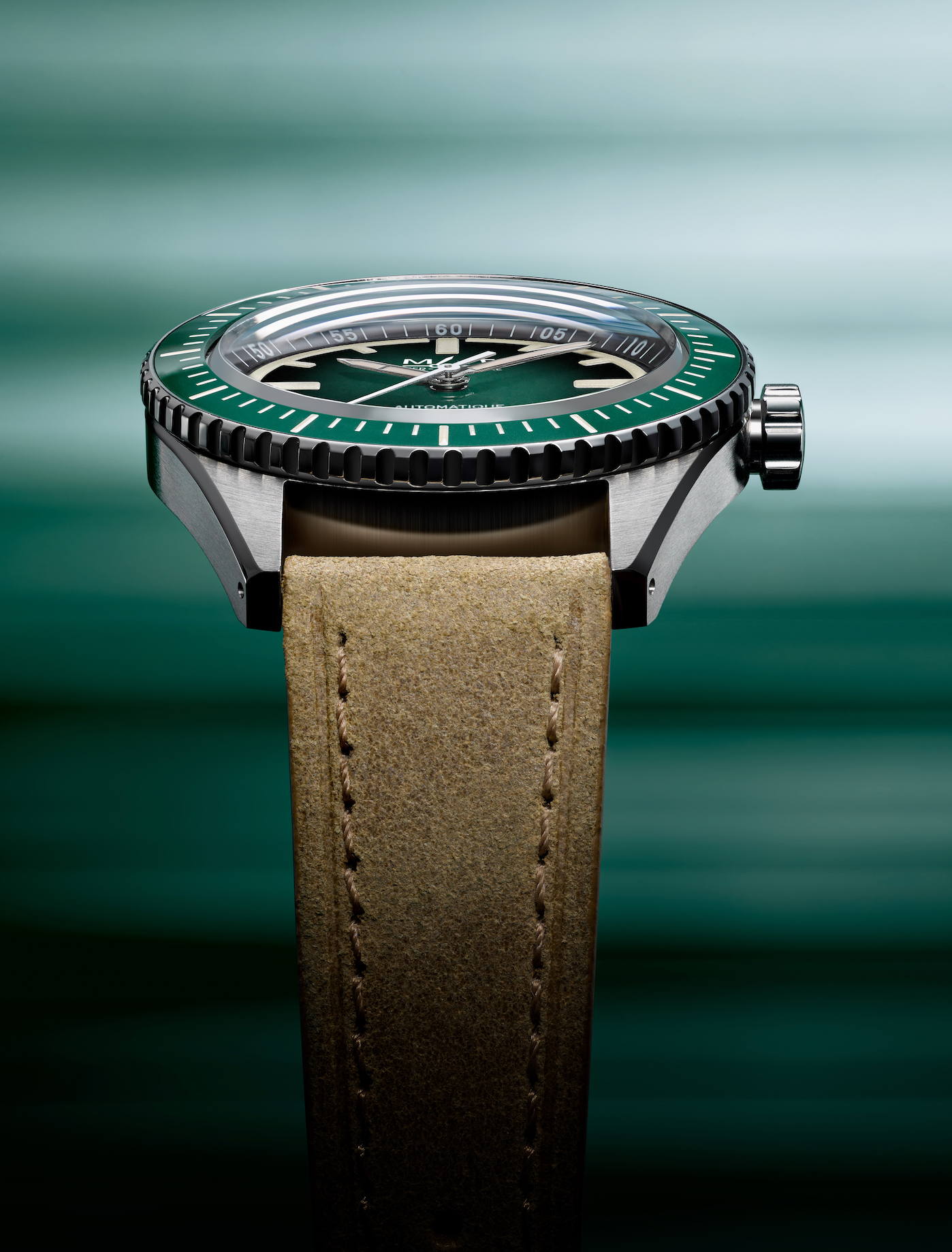 For the first time, MAT presents a grade 5 titanium model equipped with a bidirectional green ceramic bezel adorned with luminescent markings. The extreme lightness of the case subtly recalls the ultra-light aluminium chassis of racing cars from the 1960s and 1970s, combining cutting-edge technology with ergonomic comfort. Far from openly playing with automotive codes, the Picobello ‘Verde’ discreetly deciphers them. Its highly legible green gradient dial is enhanced by a cream-coloured hour track. Changing colour depending on the light and time of day, the face of the Picobello ‘Verde’ is always unique. The watch stands out for its stylistic versatility, reminiscent of British roadsters from the 1960s and 1970s adorned with ‘racing green’. Here again, the automotive inspiration is subtle, appealing to connoisseurs.