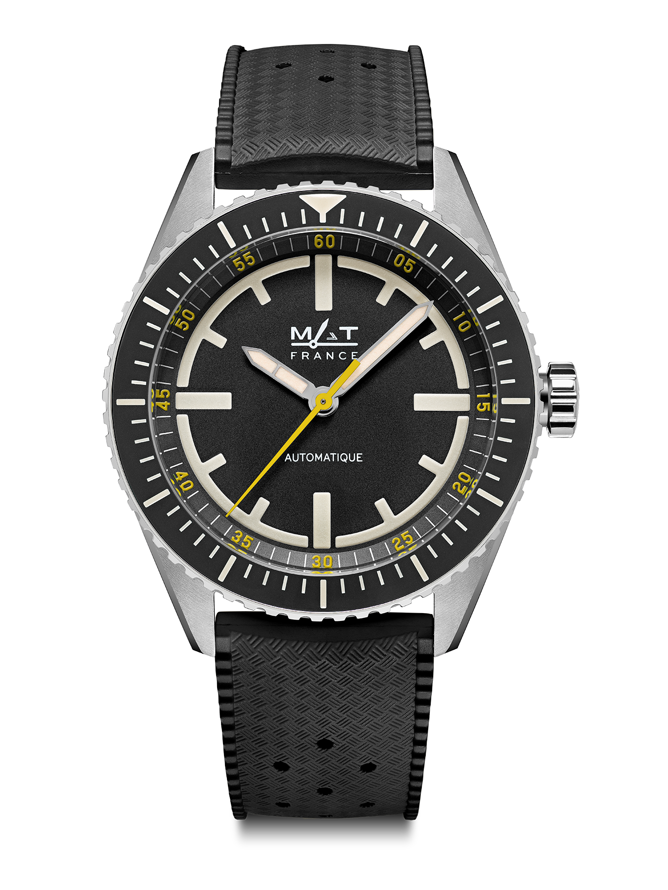 Dès le premier coup d’œil, les codes génétiques de MAT watches sont là mais réinterprétés avec subtilité et élégance. Pour la première fois, MAT watches présente ainsi un modèle en titane grade 5 doté d’une lunette bidirectionnelle en céramique avec graduation luminescente.